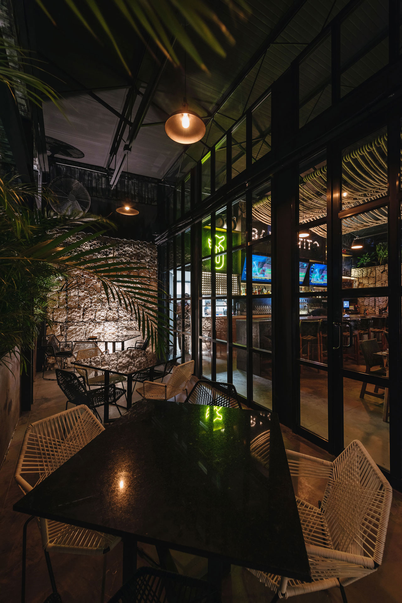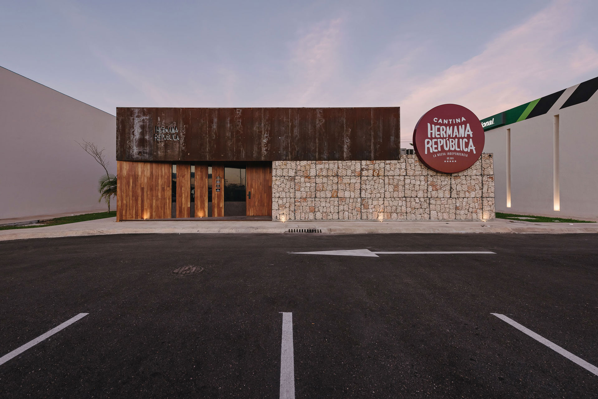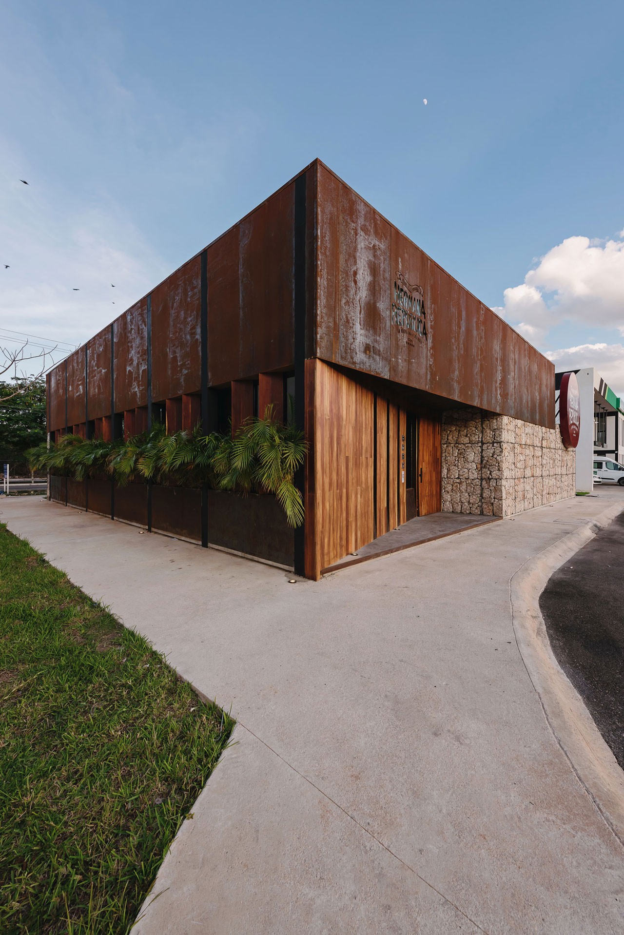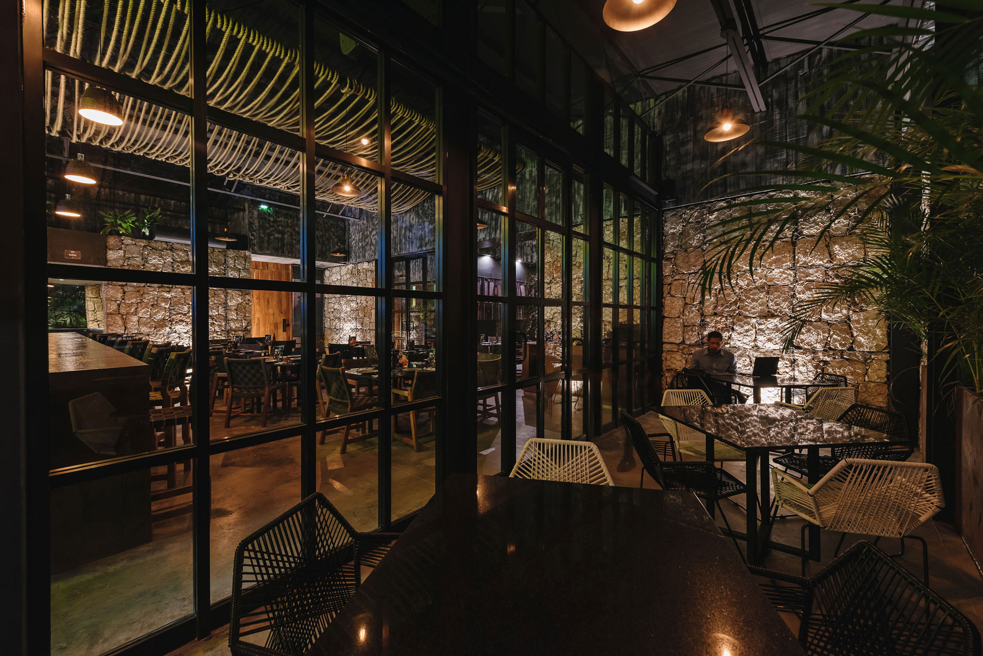 El volumen de gaviones visualmente da forma al basamento para el segundo volumen de acero; dicho volumen aloja la nave de comensales que a su vez está dividida en cuatro espacios interiores, dos que generan salones privados con ventanales al norte para aprovechar la luz natural, uno que aloja una terraza al aire libre que abre sus vistas a la avenida y el andador peatonal que comunica la avenida con un centro comercial y el área del bar central que dirige sus vistas a la contra barra.