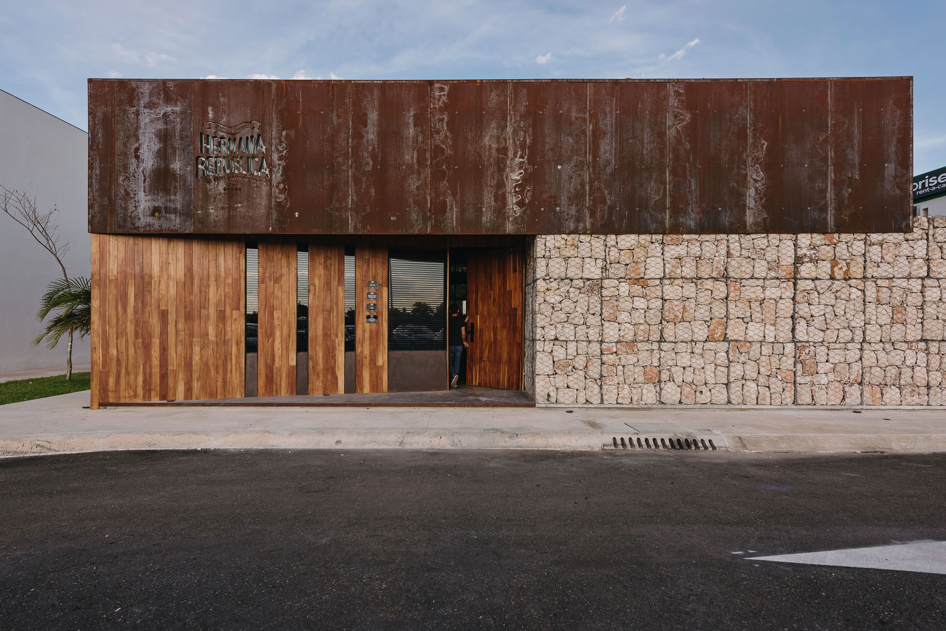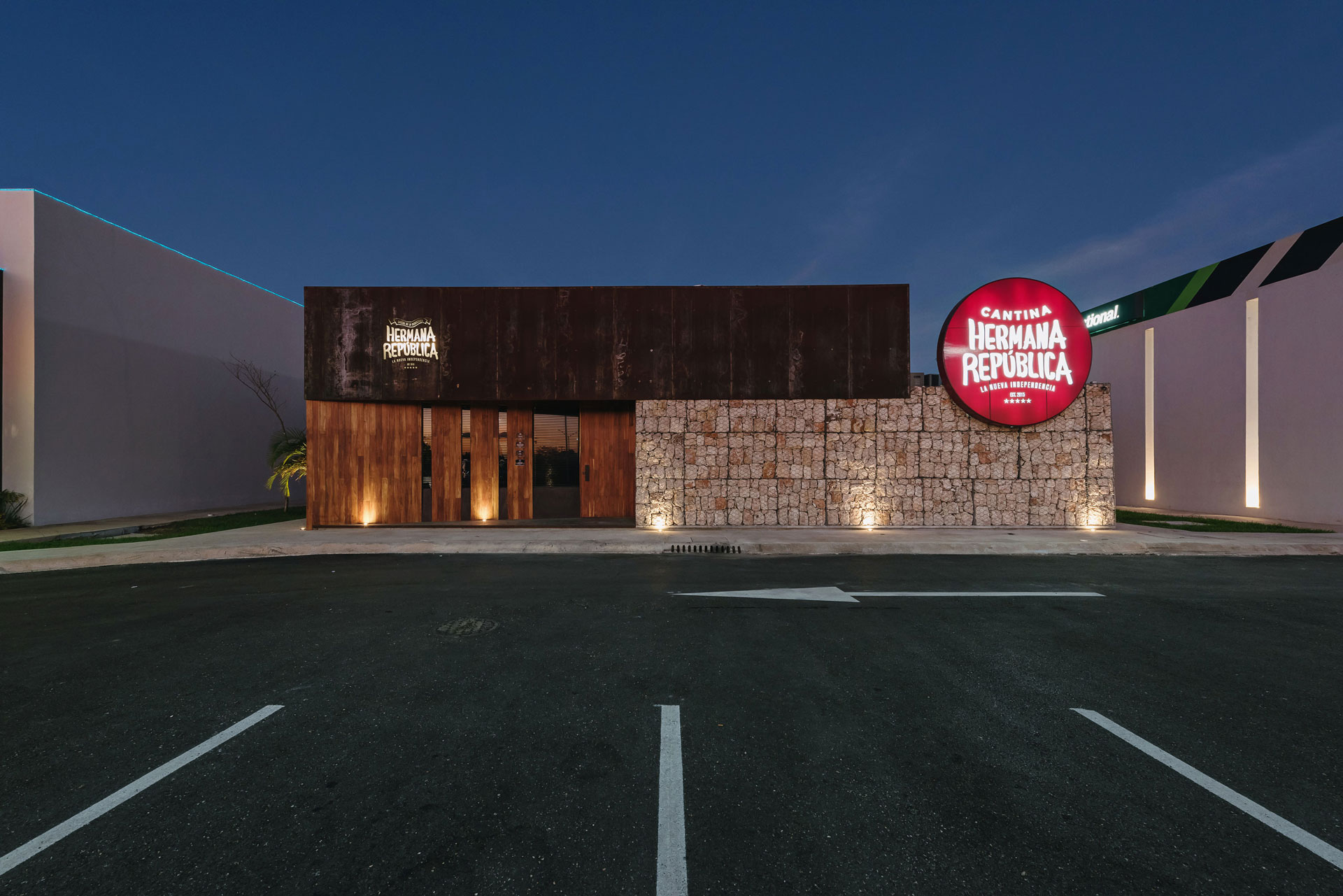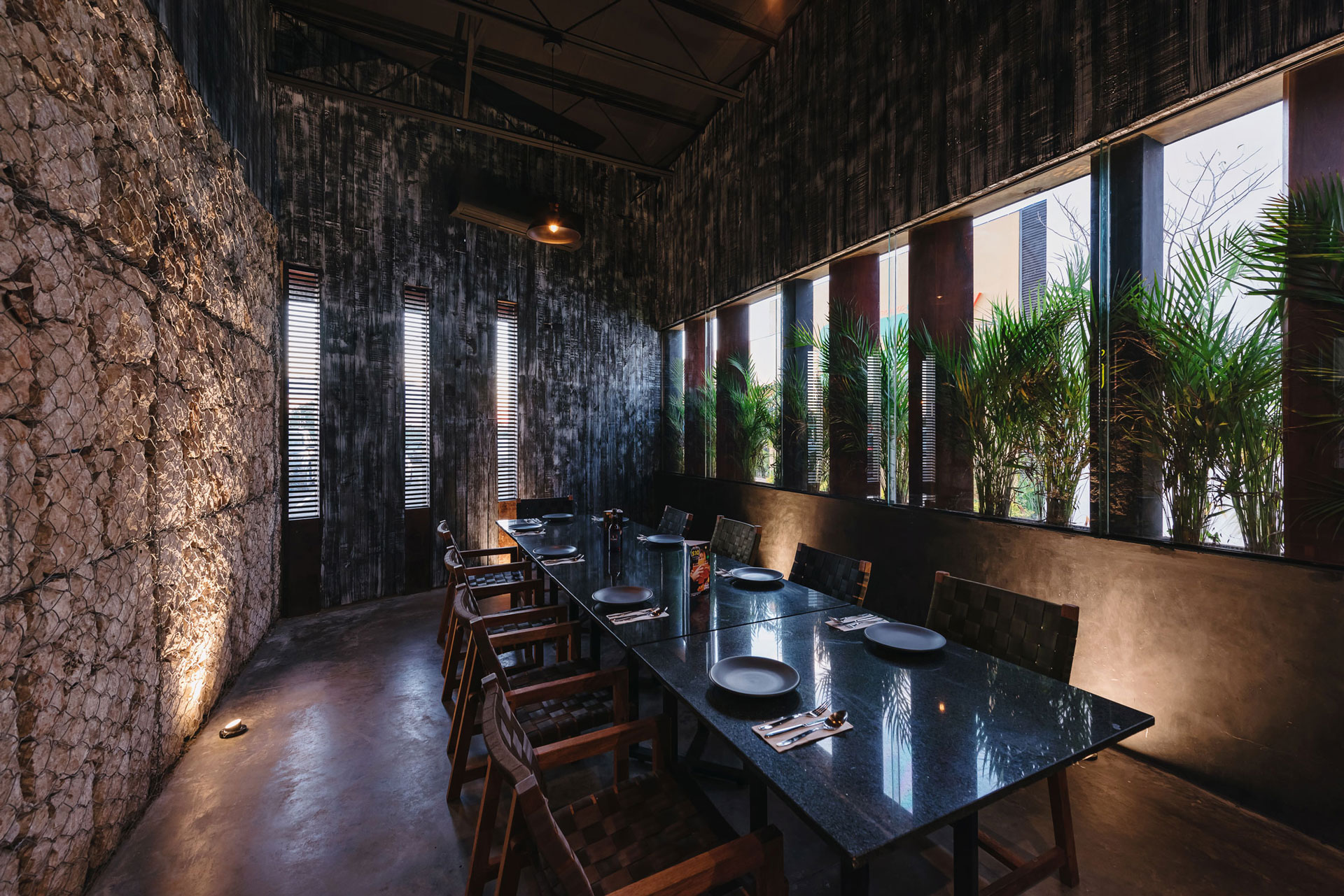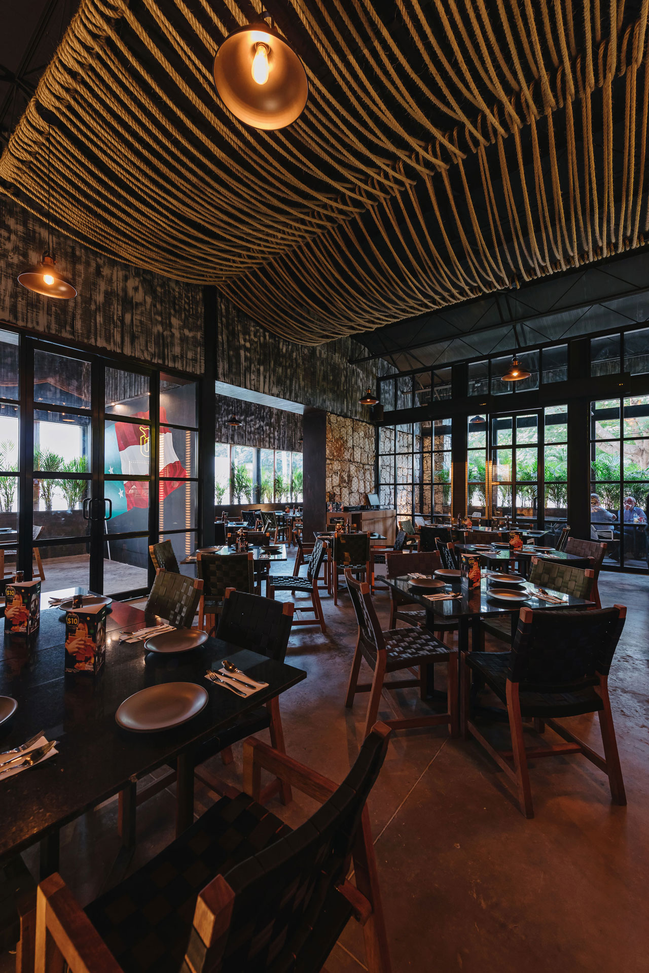 El volumen de gaviones visualmente da forma al basamento para el segundo volumen de acero; dicho volumen aloja la nave de comensales que a su vez está dividida en cuatro espacios interiores, dos que generan salones privados con ventanales al norte para aprovechar la luz natural, uno que aloja una terraza al aire libre que abre sus vistas a la avenida y el andador peatonal que comunica la avenida con un centro comercial y el área del bar central que dirige sus vistas a la contra barra.