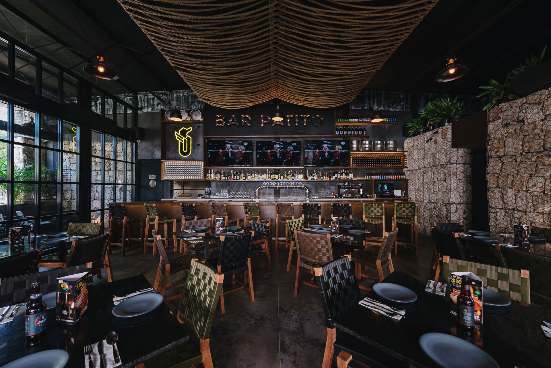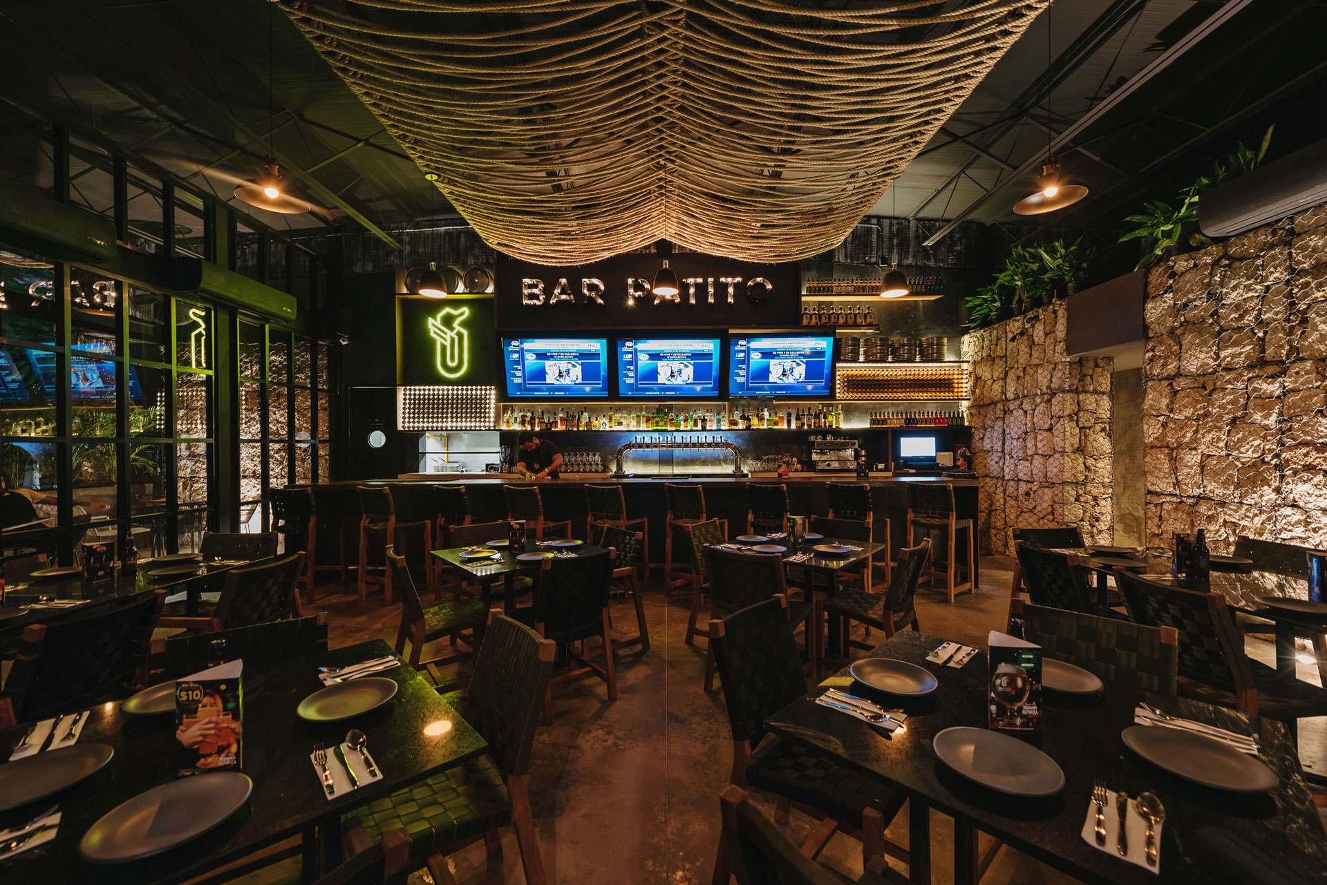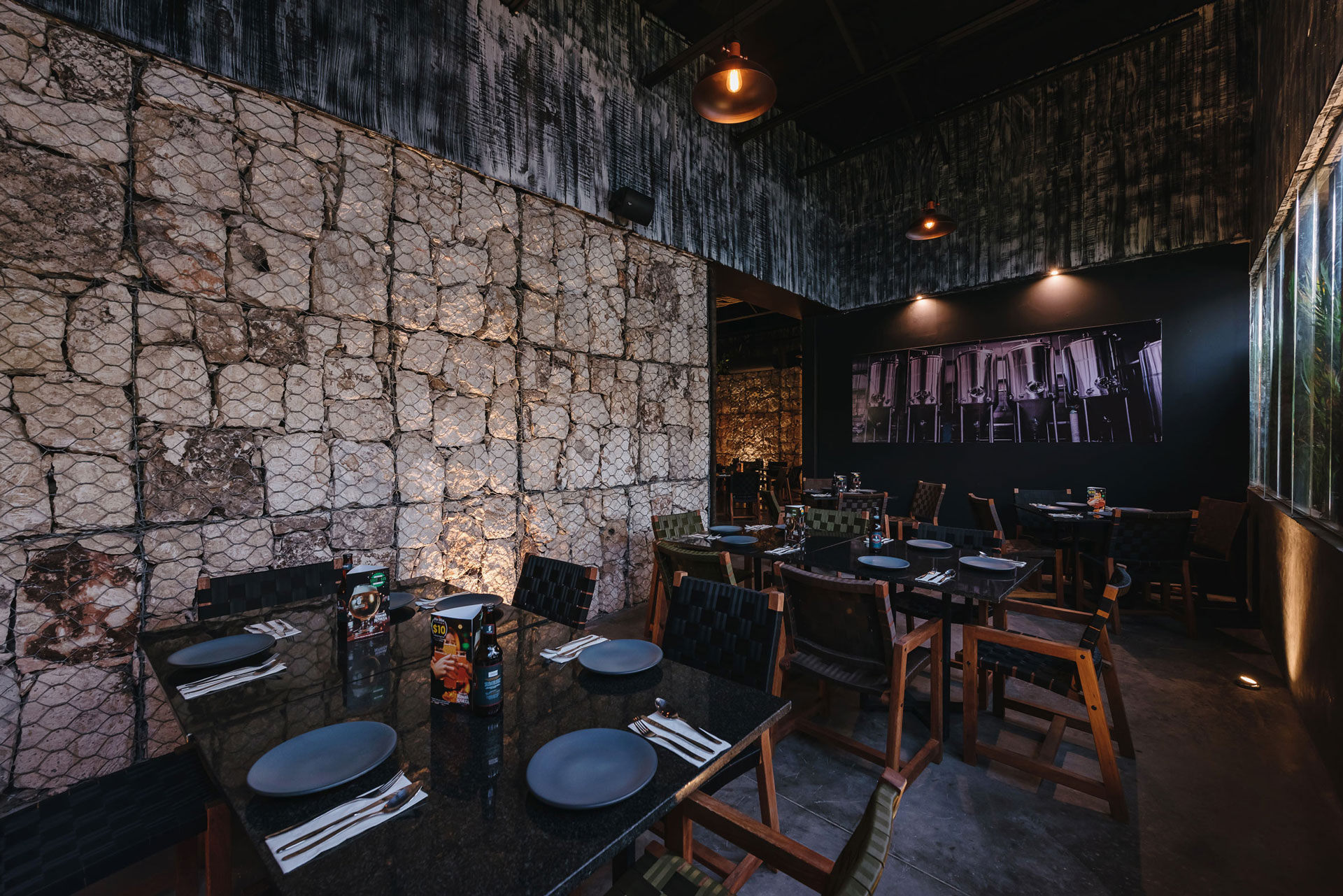 Dado que el restaurante fabrica su propia cerveza, la barra y contra barra son las protagonistas al interior, es por ello que los interiores se oscurecen para no restarles impacto visual.