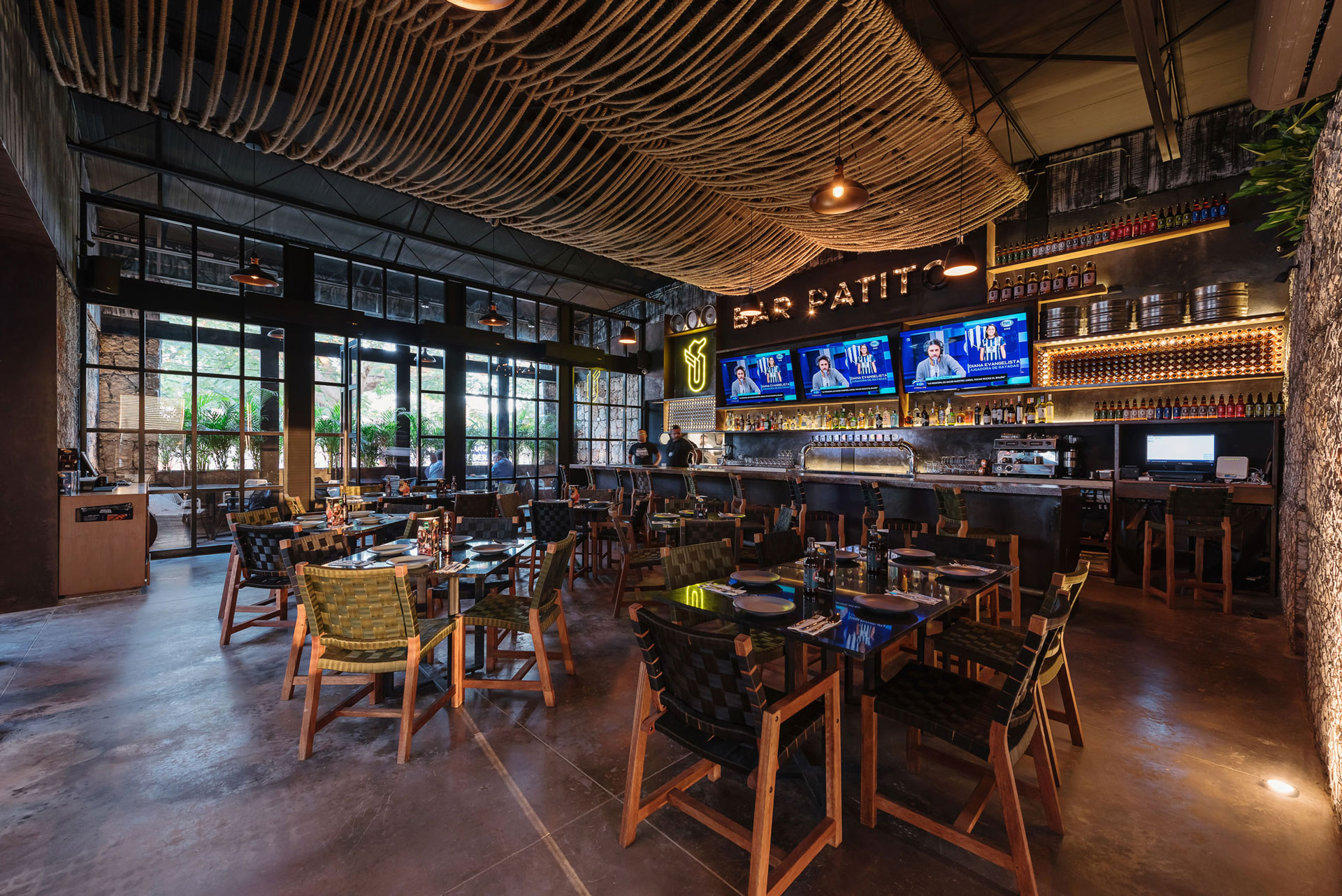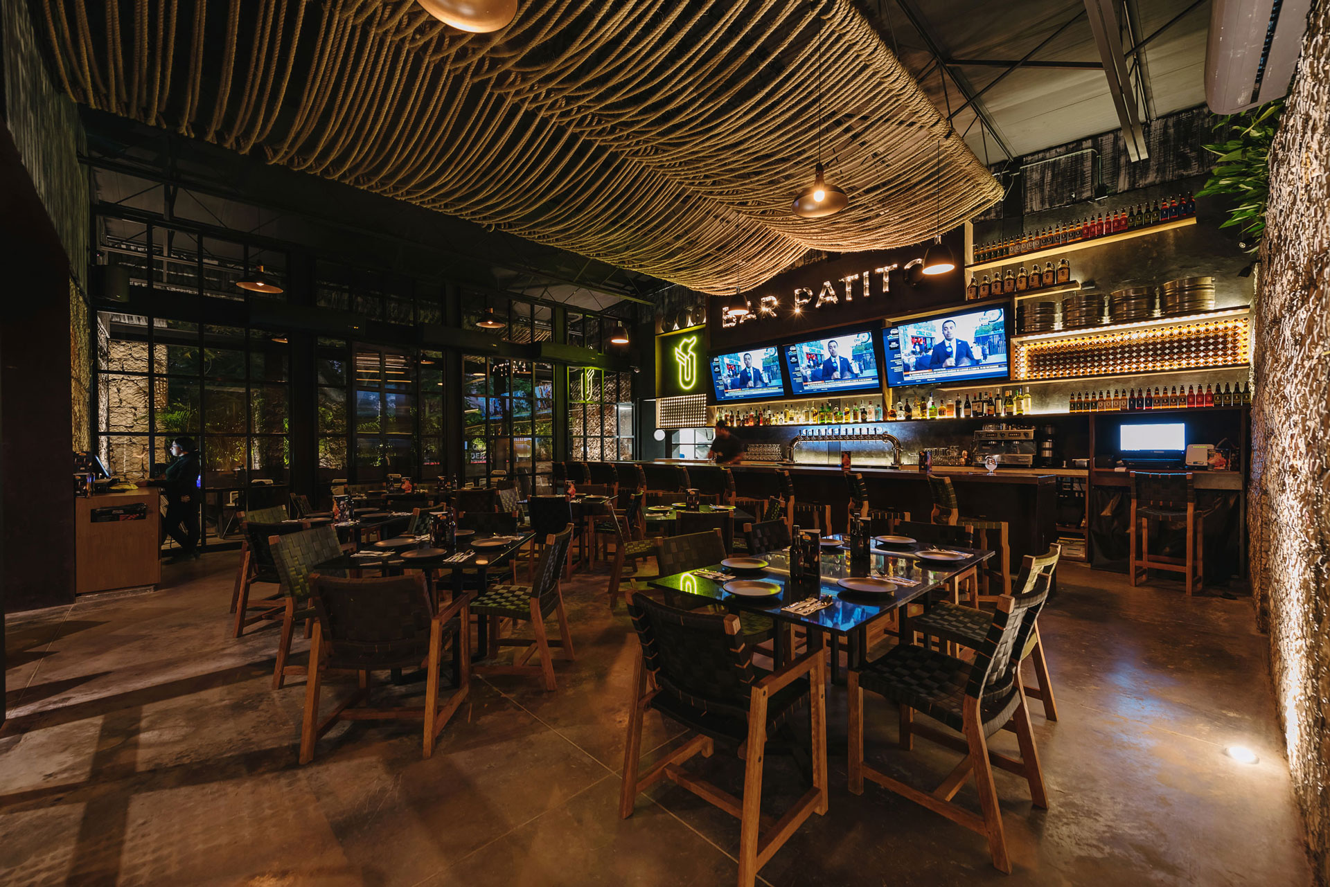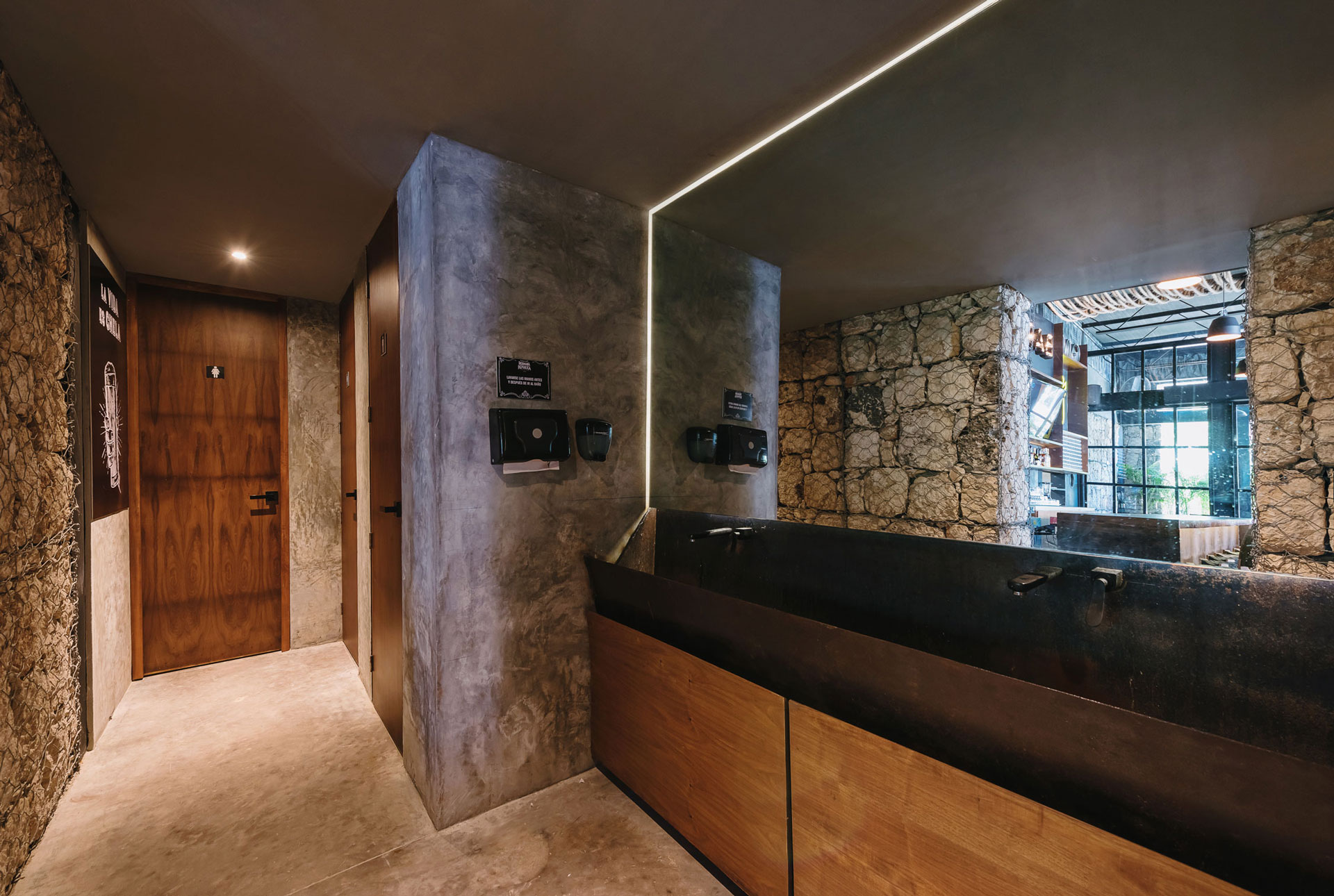Dado que el restaurante fabrica su propia cerveza, la barra y contra barra son las protagonistas al interior, es por ello que los interiores se oscurecen para no restarles impacto visual.