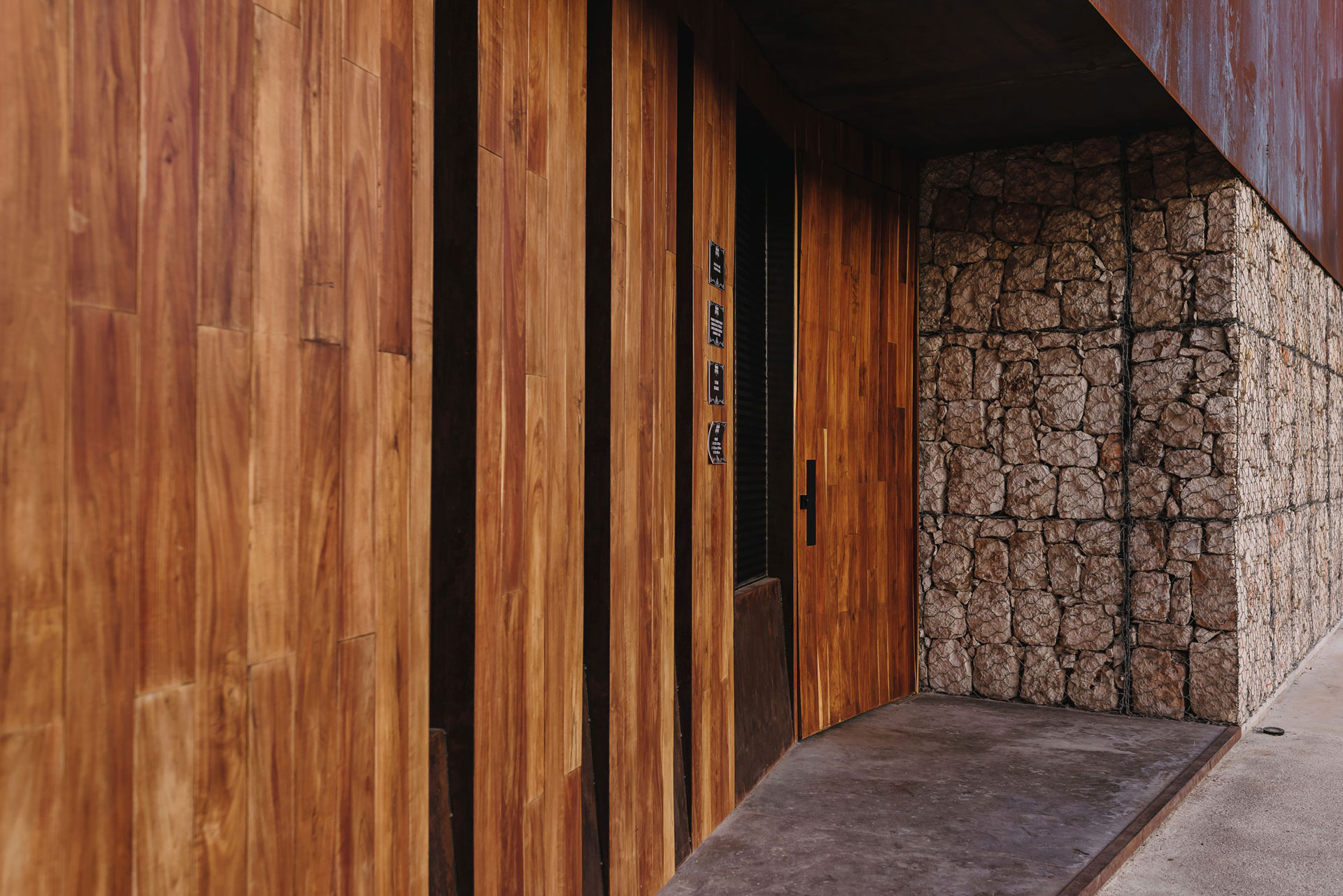 Otra de las principales intenciones del proyecto fue evidenciar el uso de uno de los materiales más importantes para el ámbito de la arquitectura y construcción regional, la piedra. Dicho elemento se empleó de forma distinta a su uso común, en este caso se implementó con un sistema de gaviones los cuales forman un volumen que alberga todas las áreas operativas y sanitarias, generando así, una fachada ventilada y ciega al exterior que se encargará de cubrir el poniente que se expone por completo en la fachada oeste.